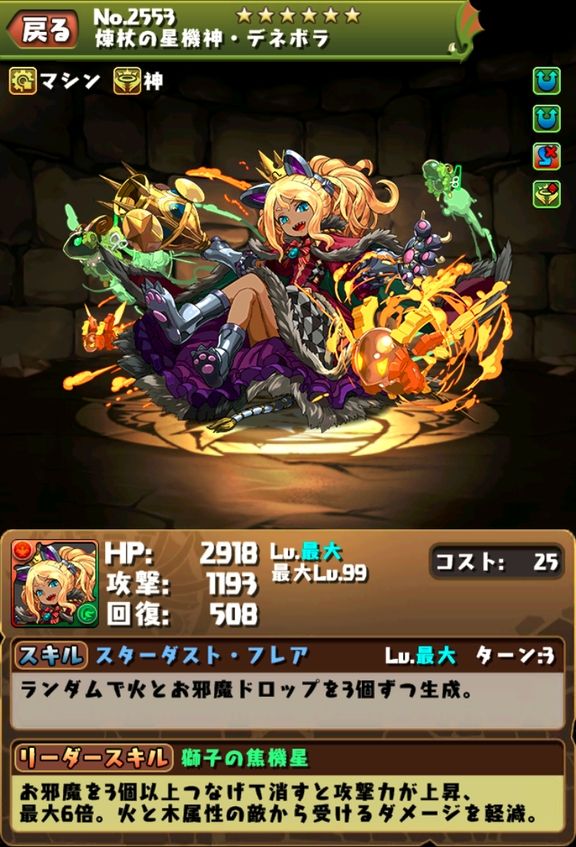 持ってる人は騙されたと思ってキン肉マンにデネボラ入れてみて。実質3ターン火6個生成くそつよい。アンタレスいると尚良い。闘技場サクサクになったよ。