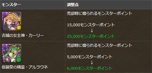 一部モンスターの売却時に得られるモンスターポイント値を調整